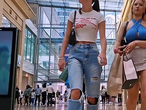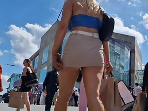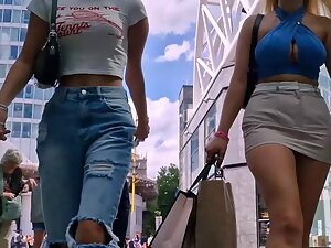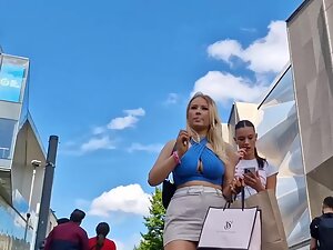 When this busty blonde squeezes her big boobs in such a modern blue top, you can be sure that everyone will notice them and that is probably her intention. Her tits are so big that they bounce around when she walks and a nice bit of her cleavage is fully visible from the front.
