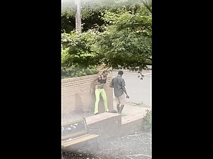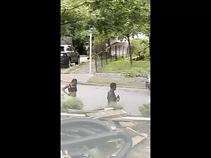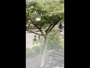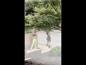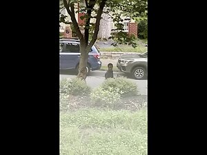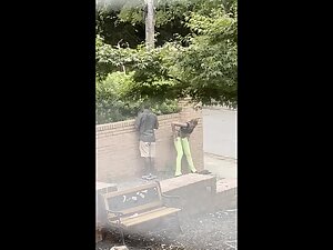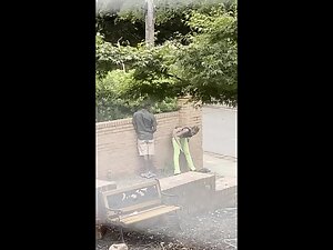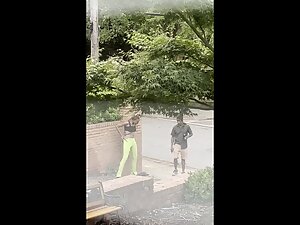 It is hard to deny that this black girl looks fuckable when she bends over like that, even when she is actually pissing in that silly pose. Voyeur zooms in on her from his house, while she is peeing all over the neighbor's wall.
