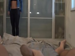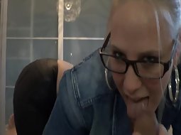 These two are roleplaying that she comes in and catches him while she is wanking off and immediately offers her assistance. She kneels in front of his dick and gives him a great blowjob. He came on her face.