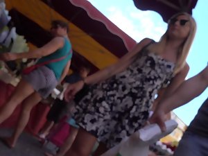 This young blonde is very sexy in her light summer dress and that forearm tattoo is also showing a dash of boldness in her. Voyeur follows her until he can see a good look of her sweet ass in upskirt, along with a full frontal segment of the video so we can match her face with those lovely butt cheeks.