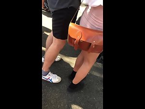 She got sexy legs and a hot ass in that miniskirt so it isn't a surprise that her boyfriend can't keep his hands off her. Voyeur is checking her out and you'll notice that her boyfriend keeps rubbing, touching and doing circles all over her ass cheeks.