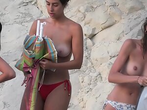 Some of these sweetheart's friends are also topless but her tits are so captivating you'll barely notice anything else. You will however notice that she got a hot juicy butt in a red thong bikini, and voyeur made sure to videotape it whenever she turns around.