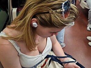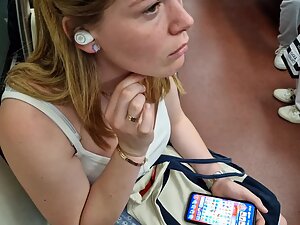 That game on her phone is totally distracting her during the train ride and it made her clueless that a voyeur is standing right in front of her, with his candid camera pointed in her downblouse. Her big boobs look impressive and you'll see how they bounce when ride becomes bumpy.