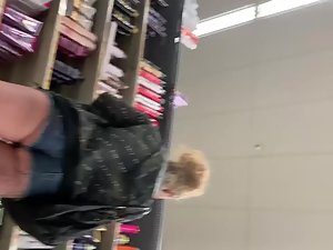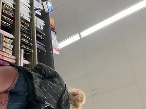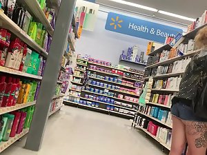 While she looks for a shampoo, voyeur is checking her out from head to toe. She got an unfinished tattoo on her thigh and those shorts are crawling inside her ass crack like a thong would. This slutty blonde looks hot from this perspective and she'll look even better when she finishes that tattoo.