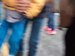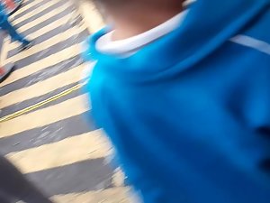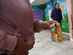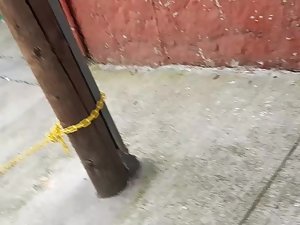 This young milf is in a hurry and voyeur was right behind her at the right time. She was bent over and her sexy thong with lace details slipped out of her tights like a whale tail. She did what she had to do and rushed away, without knowing that voyeur saw her thong and that he continues to follow her to see her juicy ass.