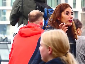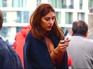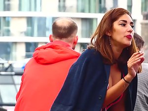 Her makeup is flawless and she looks super seductive while she smokes a cigarette with her bright red lips. She feels a bit nippy so she dropped the jacket around her shoulders and it isn't a surprise since her cleavage is fully exposed. She doesn't have big tits but they still look like they could slip out of that onesie.