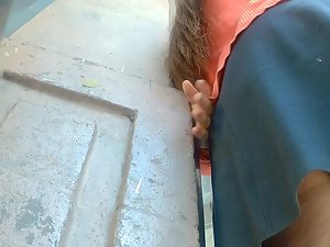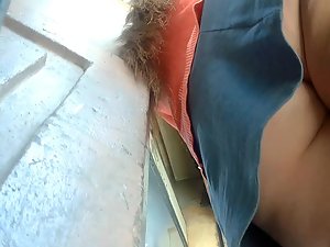 This chubby girl is leaning to the wall while talking with some friends and voyeur is having an easy job to examine her upskirt. Her butt is big and chunky and it seems like her thong is lost somewhere in the depths of her meaty ass cheeks.