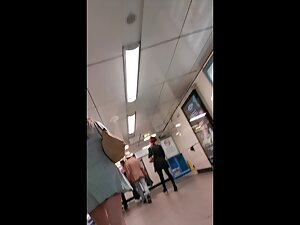 Voyeur really liked her pretty face when she ran into him so he decided it is well worth the risk to combine that face with her upskirt. He follows her up the stairs and finally gets a hot moment to see inside her skirt. She got a splendid ass and a tiny thong that went deep inside her crack.