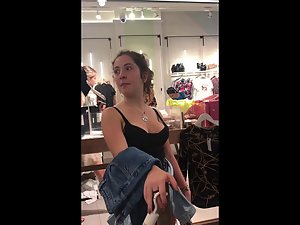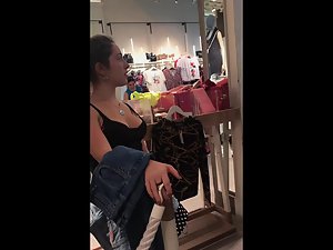 It isn't possible to look in this cute girl's direction and not notice her awesome breasts. Her tiny black top squeezed her big tits and showed off a great cleavage. Her cute smile and dimples only make her look even more arousing while you peep on her as she stands inside the clothes store. Her tits are just too sweet to behold.