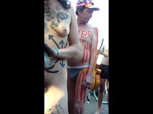 It is a nudist gathering but cameras are frowned upon so our heroic voyeur acts quickly. He is standing next to a wildest nudist girl with tattoos all over her body and he quickly makes a candid look at her hairy pussy. That big bush looks amazing, to say the least.