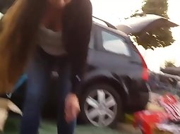 Seems like this cute girl was checking out what she can buy during this yard sale and all that bending down to grab stuff has resulted in a voyeur taking a look downblouse, seeing her sweet bare boobs.