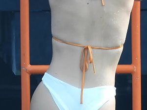 This blonde is sexy when she is dry and even sexier when she takes a dip and gets out all wet. Her high waisted bikini shows off her gorgeous pussy mound and you'll get to see the rear side when she climbs back out of the water. She is a stunning example of a sexy beach girl.