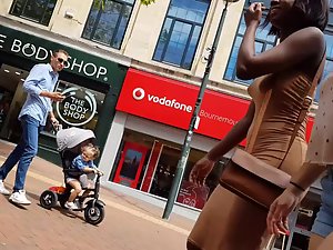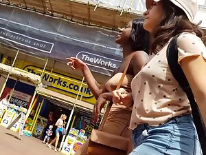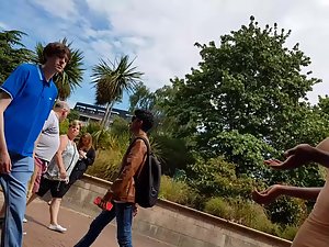 Voyeur notices this black girl's hourglass body in a tight dress as she approaches but he soon switches all of his attention on her epic boobs. She isn't wearing a bra and her sensational breasts and puffy nipples are fully outlined. Those big tits go well with her charming smile and natural beauty.