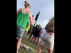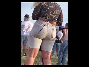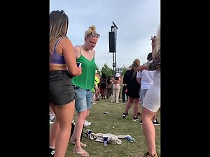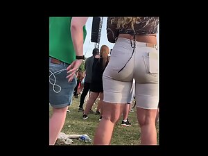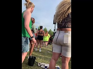 Looks like she is having a lot of fun with her friends during a concert at the festival and voyeur is enjoying the way she shakes her big butt. She got curly blonde hair that looks wacky and she definitely wanted to make her big booty visible, hence the ultra tight shorts that look like they are gonna burst and set her ass free.