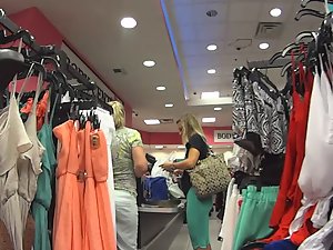 I did so many circles around this clothes store that it almost got me dizzy. I was doing it just to get a better look on this provocative blonde and her fantastic ass in green leggings. She bent over a few times while taking clothes but wait for me to come close and you'll see the real deal.