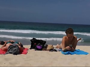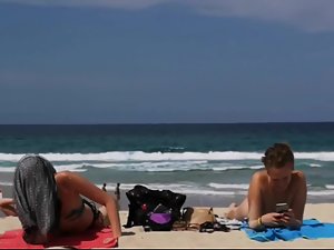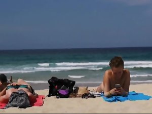 This topless girl isn't shy or anything but she keeps lying down on her belly, which means that it is impossible to see the full beauty of her tits. However, she gets up when she decides to put the bikini top back on and then finally, a good look of her sweet tits is granted.