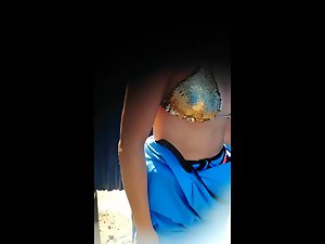 Seems like this hot woman really loves the attention on the beach, and that is why she puts on such a shiny and glittery bikini. However, she didn't know that she'll get some attention even while she is still inside the beach cabin, without the bikini. Voyeur peeps on her firm perky tits and hard nipples, well before the bikini is covering them.