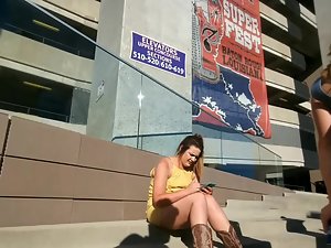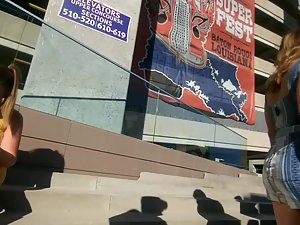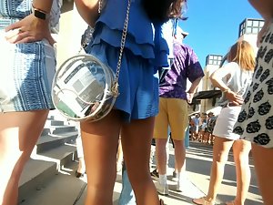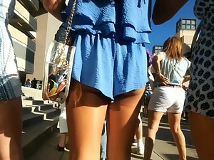 This hottie is wearing such a short and loose outfit that her firm round buttocks are falling right out of it. Voyeur got very close to her while she was standing still and he videotaped it to show the amazing roundness and smooth skin that is plainly visible, in the middle of the street.