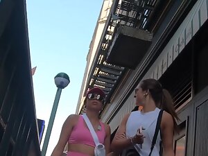 These two fit friends are giggling and chatting while they walk around in matching gym shorts and it is impossible to miss them when they are together on the street. Voyeur couldn't decide if ass in pink or ass in blue shorts was hotter so he made sure to check out both of them.