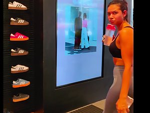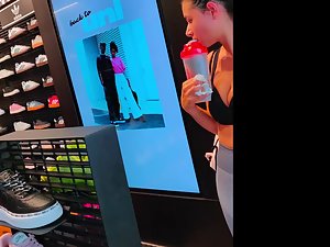 Voyeur caught this fitness girl in the shopping mall and it seems that she didn't bother with changing her clothes after a workout in the gym. She is in her tight leggings and her tits are practically bursting out of that tiny black top while she sips on her protein shake.
