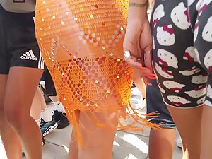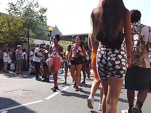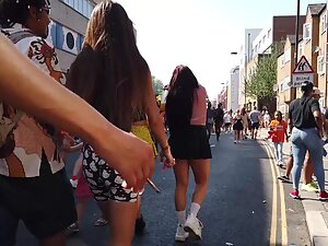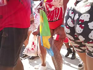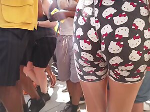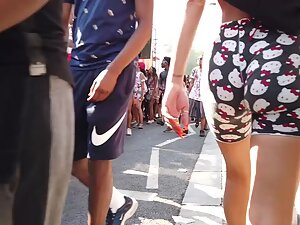 This skinny girl walks energetically through the party crowd on the street and she does a dance move every now and then. Voyeur follows her sexy appearance and he makes sure to focus on her lovely small butt in tight hello kitty shorts. Her ass cheeks look small but they are certainly feisty.