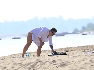 Short hairstyle makes her look like a lesbian when she arrives to the naked beach and voyeur can't keep his candid camera off her. She is big and curvy, and more then fuckable when she gets naked on the beach.
