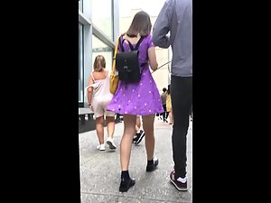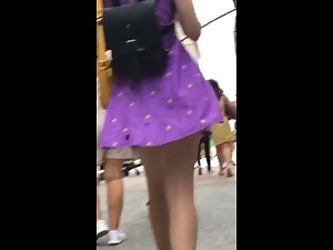 This is the girl that is able to provide material for the weirdest boners ever. We can almost say, sexy meme material. Her purple skirt is funny, with cartoonish characters, and to make things even better, she wears plastic sandals and socks on her feet. With all that in mind, her upskirt shows her sexy knickers and a hot butt, which makes her fuckable in the oddest way imaginable. She also got a cute face, if that matters too.