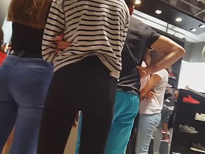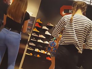Big crowd in the shoe store yet voyeur manages to single out the hottest girl in there, a gorgeous redhead that was checking out sneakers and talking with her friends. She got a fantastic ass in tight blue jeans and when she turns around, you'll see her face is gorgeous too.