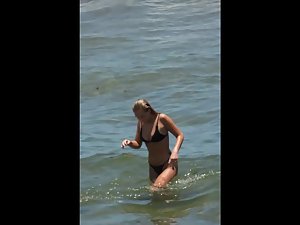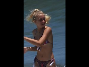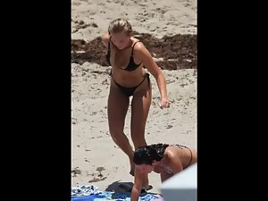 This teenage blonde is the kind of a girl that we all love resting our eyes on. She is chilling on the beach with her friend and voyeur notices her exceptional body in a thong bikini. She swims, suntans and laughs with her friend, looking lovely regardless of what she does. She is tall and smoking hot, with an amazing hourglass figure.