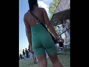 Just standing behind this girl in green shorts is enough to feel like you're in a an erotic movie. Tightness of her outfit is showing all the magic of her fine bubble butt. Those butt cheeks wobble and change shape whenever she moves or changes stance.