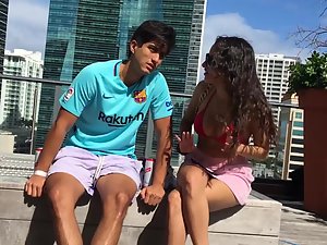 Prowling around a fancy pool party and the voyeur noticed that two interesting individuals isolated themselves on a bench. Looks like the guy was trying to hard to score with this slutty girl and he didn't even notice that her body language is signaling that she is more than ready for everything. She keeps spreading her legs and emphasizing her big tits while they flirt.