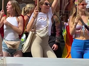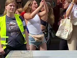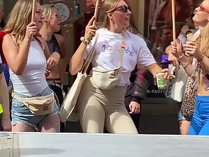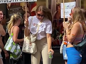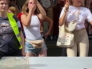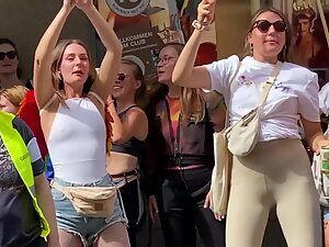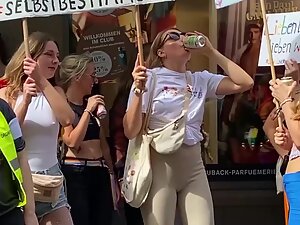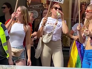 She is partying and protesting with a sign at the same time and voyeur is admiring something totally different about her. This pretty slim girl isn't wearing any bra and her hard nipples are literally poking through her white top.