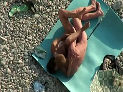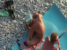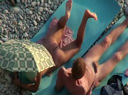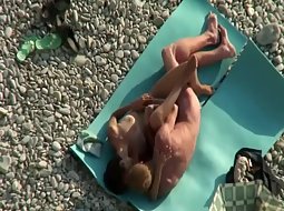 These two were lying together, sunbathing on the beach, when the guy got crazy horny and decided he needs to empty his balls. They mingled in a weird pose and he fucked her like that, letting go of his juices.