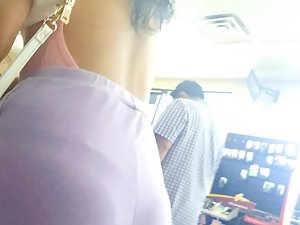 It is impossible to stand behind this woman even for a little bit, without thinking about fucking her. Her purple shorts show off all the splendor of her bubble butt and her naked back show off her smooth skin. She is sexy in every possible way and voyeur simply had to make a sneaky video of her from point blank range.