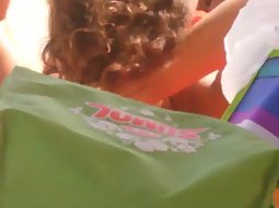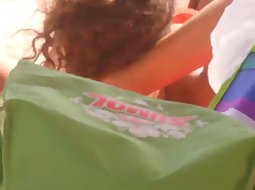She didn't even realize that her pointy nipples jumped out of her bikini while she tanned on the beach so a voyeur took his opportunity to film her magnificent boobs from above her. She had no idea he is doing it.