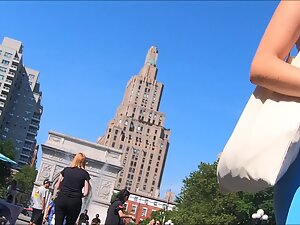 She is cute and looks sporty in those light blue shorts but she has no idea that another sexy fact about her became visible. Her tiny thong and tight shorts made her cameltoe visible and it is absolutely obvious that this smiling blonde got a very big pussy.