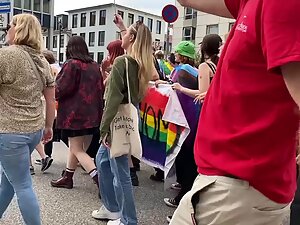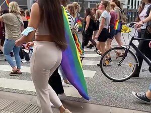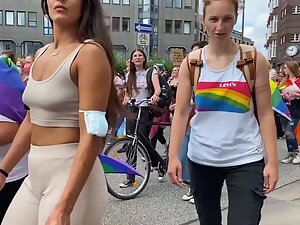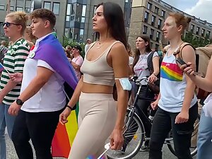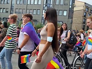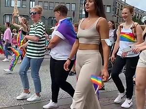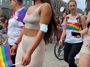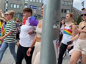 She is proudly walking in the parade and voyeur is pretending to film the whole thing, while he actually focused mostly on her sweet tits in a top, without a bra. Seems like she is into fitness and that can only explain why her tits are so tiny and her butt is so big.