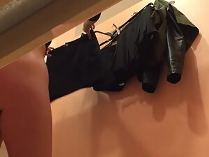 This thick blonde got amazing curves and the best part about her trying clothes is the fact that she does it without any panties. Voyeur caught her marvelous pussy with a neat tiny patch of pubes as well as her naked ass. She looks amazing when she bends over in that brand new black skirt.
