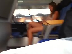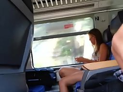 This hot girl didn't have any idea what is happening on the train, right across her seat. Voyeur had a clear look on her long legs and sexy figure so he wanked one off while she was just eating and not noticing it.