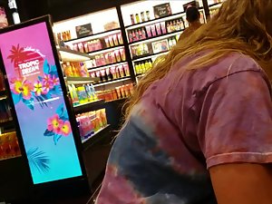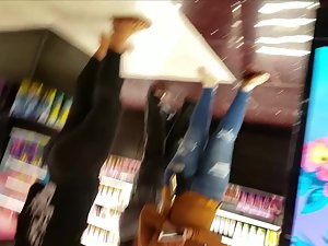It certainly isn't often that you'll see a hot girl in this pose in some cosmetics store and voyeur just had to make a video of that sexy pose. She is looking for something in the drawers and he easily gets his camera underneath her, to see how her yummy ass looks from that perspective. That pose stretches her shorts so much that it kinda looks like a cameltoe is forming.