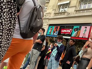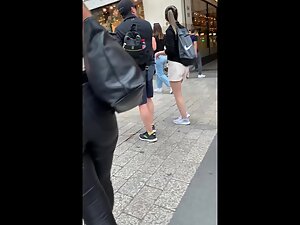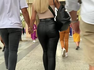 She is walking and holding hands with her boyfriend so it was risky for the voyeur but he really wanted a video memory of such perfection in tight black leather pants. She is stunning, and the best part of her is those amazing bubbly ass cheeks that simply pop out of her leather pants.
