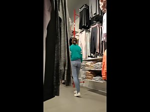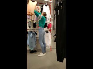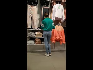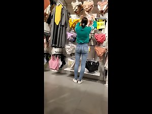 All that this slim hottie needs to do is stand still and her sweet ass in jeans will look adorable. She is checking out clothes in the store and voyeur can't stop looking at her perky butt. Jeans are squeezing her ass so much that her panties are fully outlined.