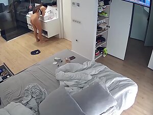 One hidden camera covers her entire bedroom and bathroom and it caught her half naked while she lazily chills on the bed and looks for what to do. Her pussy looks smooth and delicious and she just stretches and yawns on the bed.