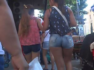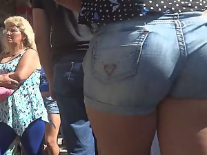 Whenever I see such a tempting ass, I have to spy on it. This hot girl's tight shorts were so nicely filled up with round ass cheeks that I had to film it. She got a sexy hourglass body curve and it looked majestic to imagine her sitting on a hard dick. I spotted her in the crowd.