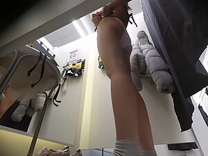 It looks like being sexy on the beach is very important to this slim milf so she takes her time while picking out a new bikini. Voyeur is peeping on her ass, tits and pussy while she is trying to decide what bikini she'll buy.