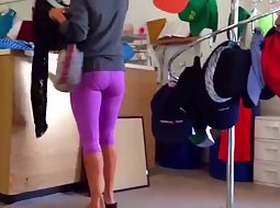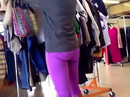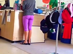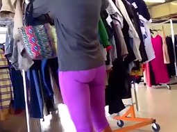 This sexy milf got a nice body and she was spied by a voyeur while she was checking out some clothes in the store and paying for it a bit later. Her ass looked quite good in those lightly colored purple tights.