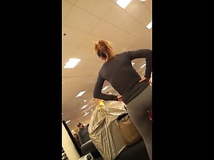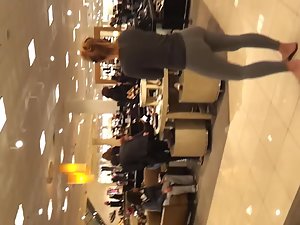 Voyeur makes a circle around this milf, while she waits for someone in the store. Her big soft butt is squeezed solid in her grey tights and it made her panties fully outlined themselves underneath. Her wide hips and womanly ass cheeks look good.