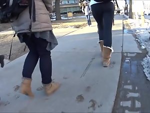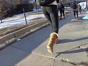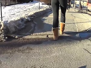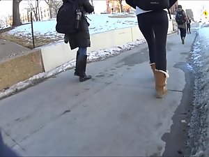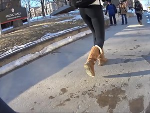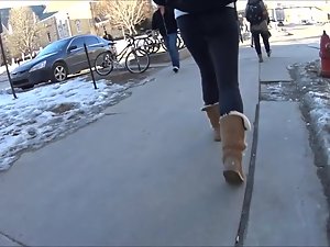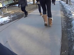 Such simple black tights and such simple wool boots, yet she looks perfect in them. Very causal and slick at the same time. Voyeur follows her while she walks in front of him and he keeps the camera focused on her thick butt. Needless to say, she doesn't even know that he made a video of her bubble butt in tights.