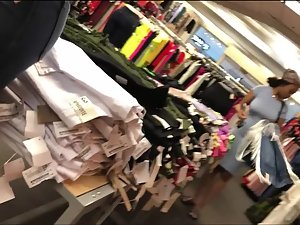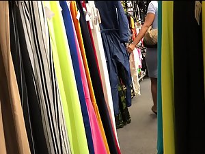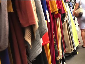 That thin tight dress she is wearing does not leave anything to the imagination. She isn't wearing a bra and her curvy body is squeezed so tightly that everything shows, including her piercings. Her big boobs got noticeable nipple piercings and even her belly button seems to have a piercing of its own. She is slowly browsing clothes in the store, without being aware that a voyeur is browsing her as well.