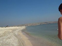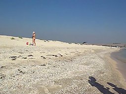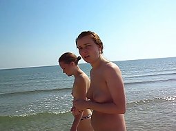 These two nudist girls are walking by the ocean and they even looked at the voyeur while passing him by, but they didn't notice that he is filming their naked bodies.